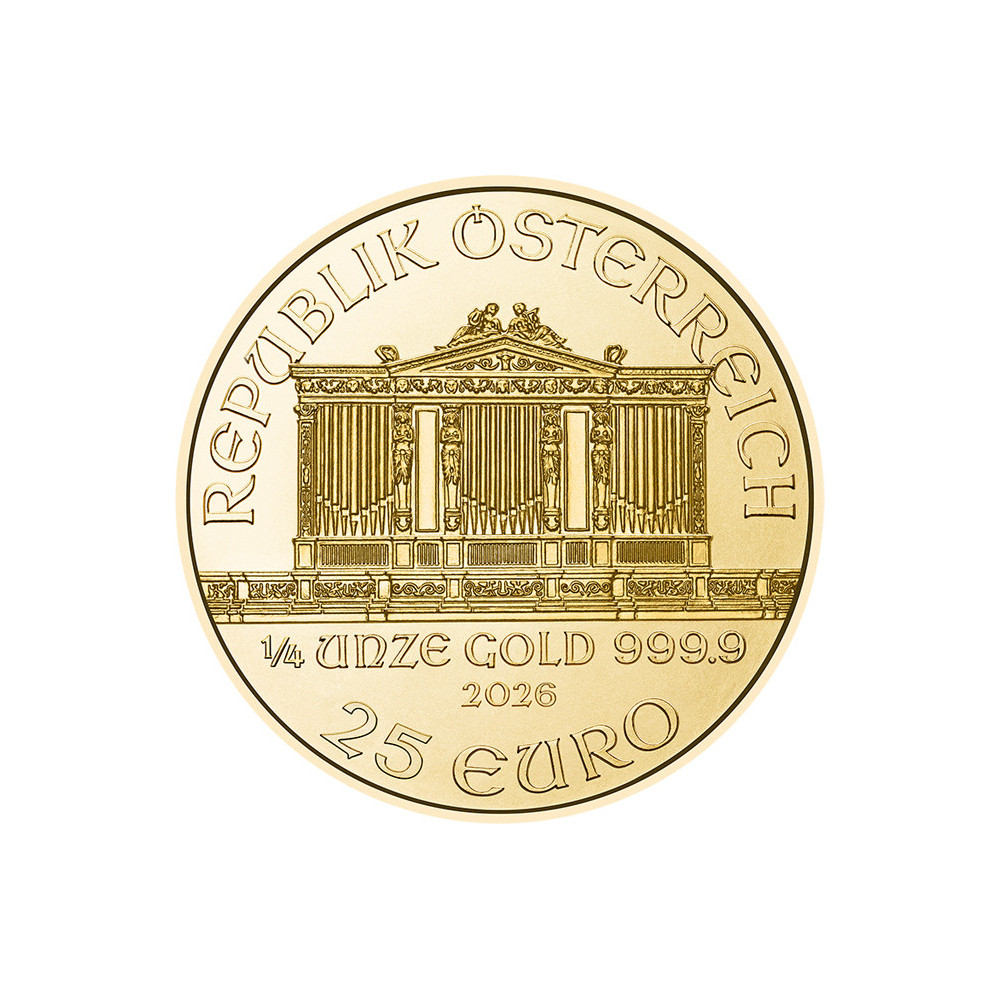 A Bécsi Filharmonikusok a nevét a híres osztrák zenekarnak köszönheti, amely a világ egyik legjobbja. Az aranyérme előlapja a bécsi Musikverein nagy orgonáját ábrázolja. Az orgona alatt az 1/4 uncia súly, a 999,9 finomságú finomság, a verés éve és a 25 EURO névérték szerepel. Felette a "REPUPLIK ÖSTERREICH" felirat olvasható. A hátoldalon a Filharmonikusok néhány hangszere látható, a felső peremen pedig a zenekar neve és a "WIENER PHILHAMRONIKER" aranyérme. A fenti aranyérmékhez hasonlóan a Bécsi Filharmonikusok is kapható 1oz, 1/2oz, 1/10oz és 1/25oz méretben.