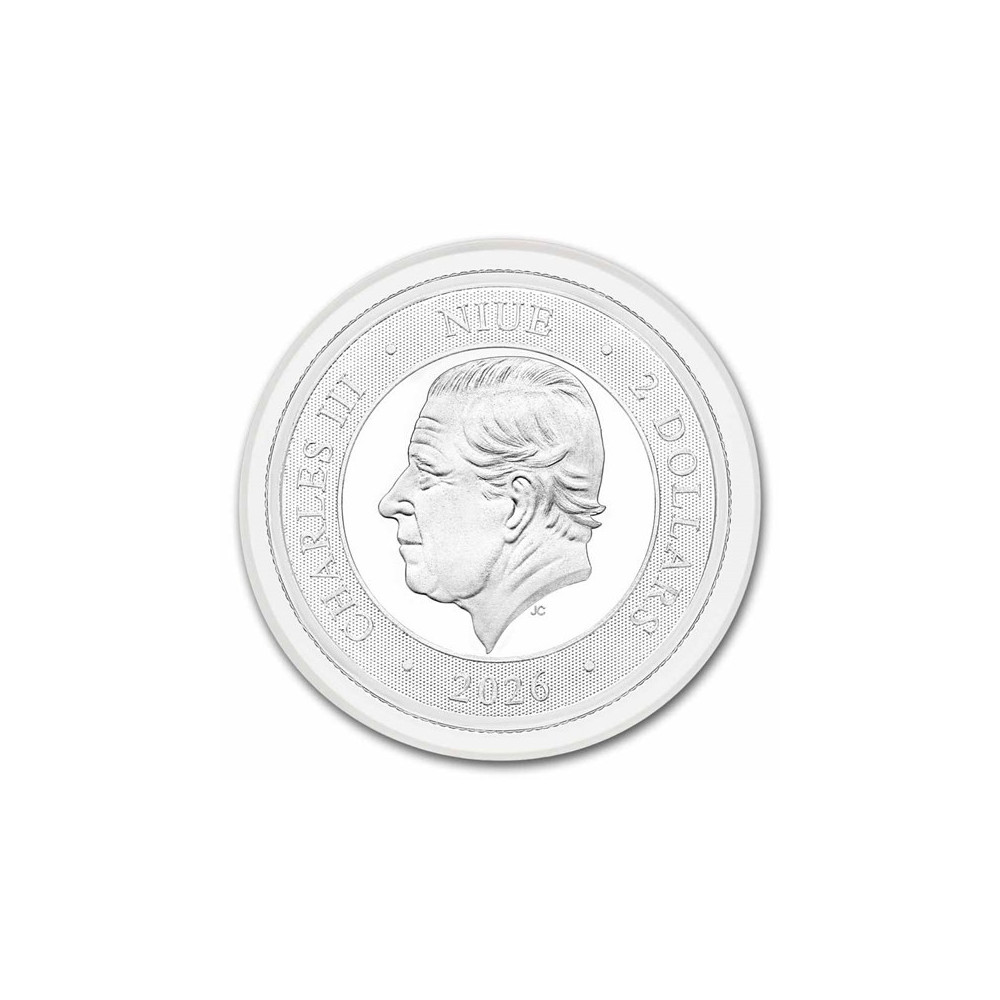 Az érme előlapján III. Károly király balra néző (koronázatlan) feje látható. Alatta apró betűkkel a művész JC (Jody Clark) monogramja olvasható. Az érme körül az uralkodó nevét, a névértéket és a kibocsátás dátumát tartalmazó felirat található: CHARLES III - NIUE - 2 DOLLÁR - 2026 -. A feliratot egy nagy körben mikroszkopikus pöttyökkel helyezték el.