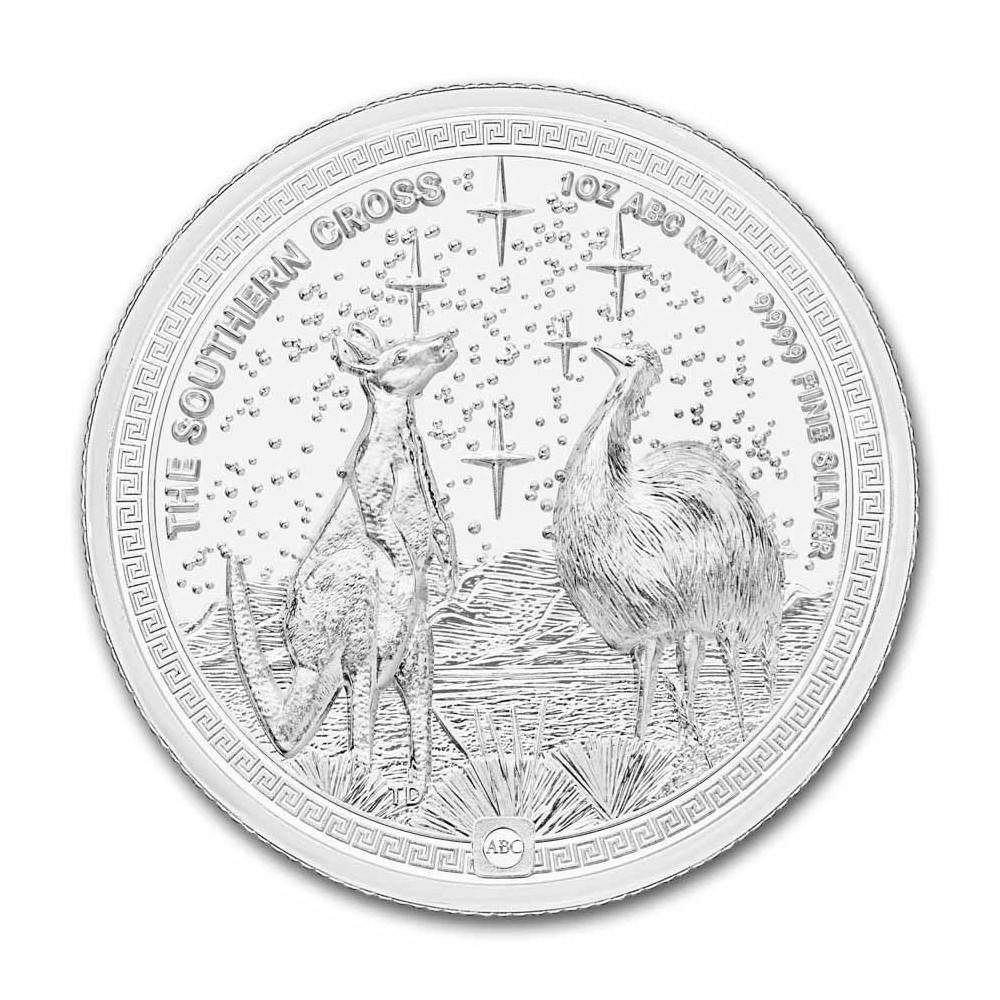 Az érme hátlapján egy kenguru és egy emu látható egy kanyargós keretben, ausztrál hátországbeli tájban, mindketten a csillagos égbolton kiemelt Déli Kereszt csillagkép felé néznek. A fű bal alsó részén a tervező monogramja, TD, Tony Dean. A bal felső sarokban a THE SOUTHERN CROSS felirat olvasható. A jobb felső részen az 1 OZ ABC MINT 9999 FINE SILVER felirat olvasható. Az érme szélén lévő mintát az ABC pénzverdejel szakítja meg, amely egy négyzet alakú ingot formáz.