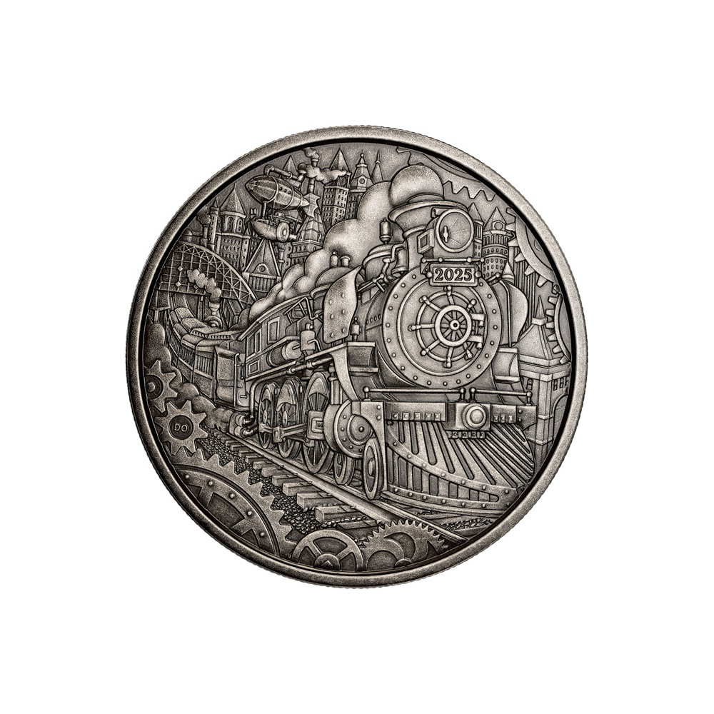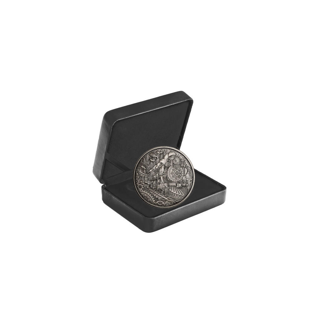 Az érme 3 uncia 99,99%-os tisztaságú ezüstből készült, és a világszerte 2500 darabos limitált kiadás része. A fogazott perem fokozza az ipari megjelenést, az antikolás pedig finom patinát kölcsönöz az érmének, amely kiemeli a régi fémek és gépek megjelenését. A hátlapon és az előoldalon számos vésett részlet, például fogaskerekek jelennek meg, vonzó steampunk motívumot alkotva.