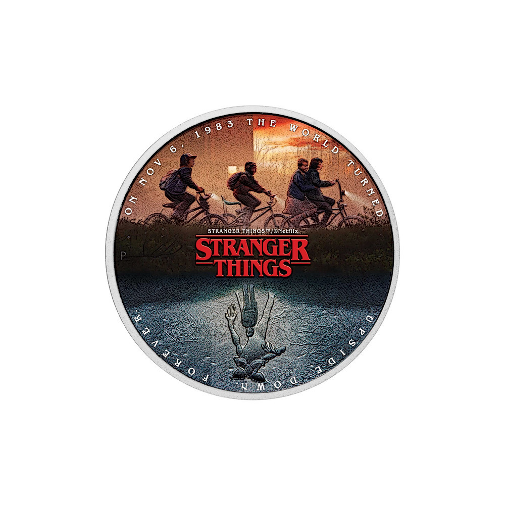 Az érme színes hátlapján Hawkins titokzatos világa látható. Az érme felső fele Mike-ot, Dustint, Lucast és Elevenet ábrázolja egy kalandos biciklitúrán, míg az alsó fele a hátborzongató Felső világot ábrázolja Will-lel és egy demogorgon baljós jelenlétével. A képen a következő felirat olvasható: "1983. november 6-án a világ a feje tetejére fordult. ÖRÖKRE." a "STRANGER THINGS" logóval és a Perth Mint "P" verdejelével együtt.