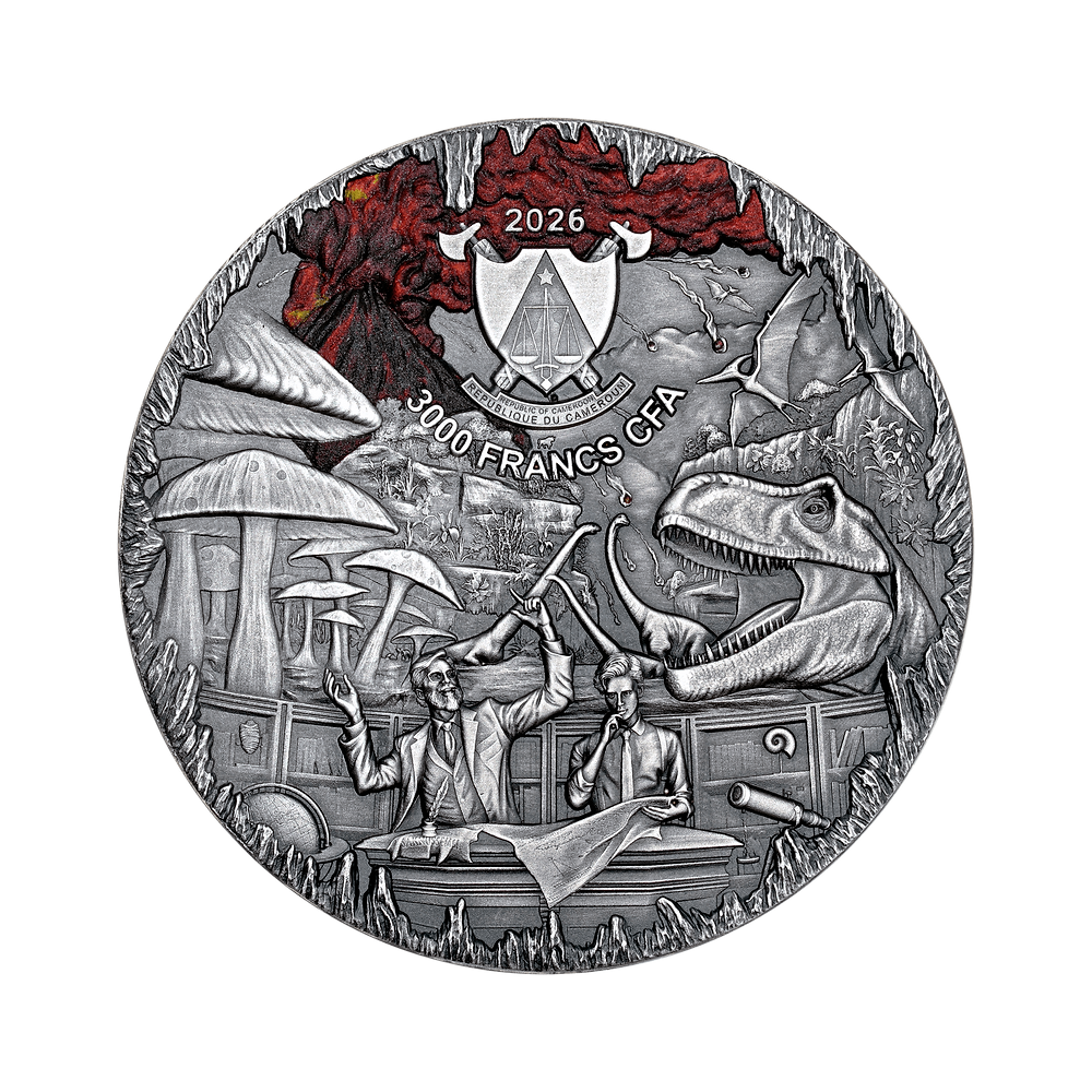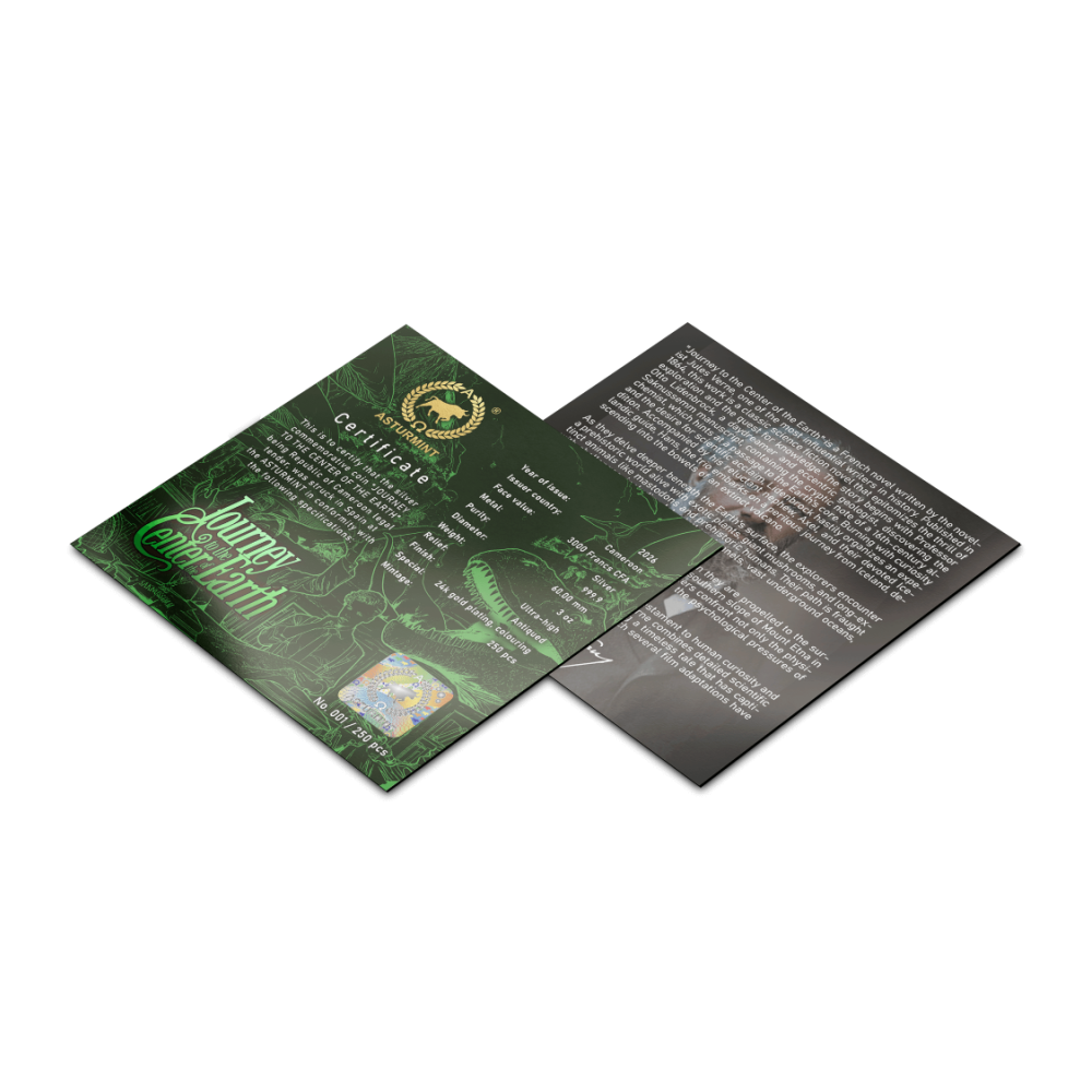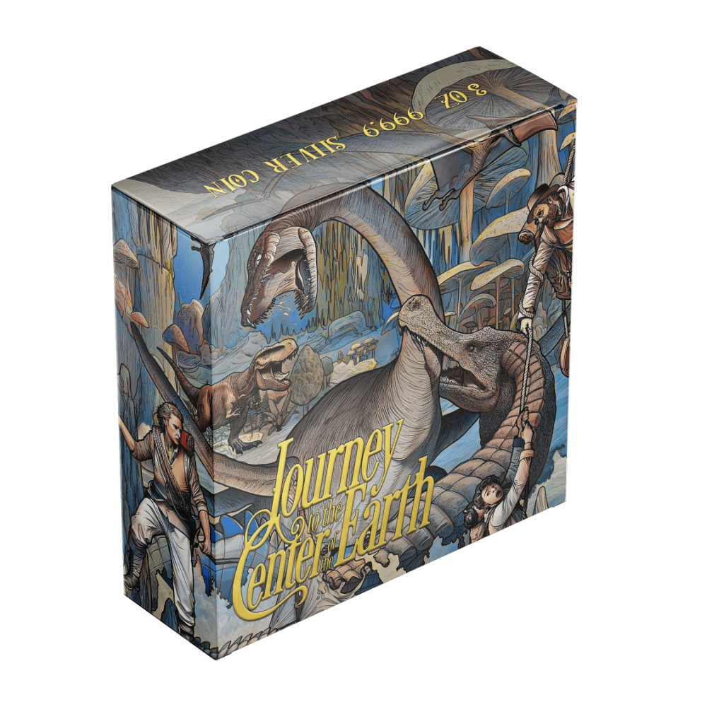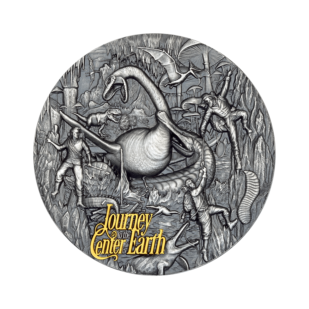 Ez a gyönyörű, 3 unciás ezüstérme Jules Verne "Utazás a Föld középpontjába" című regényében merül el. Lidenbrock professzor lázas ambíciója a félelem és a csodálkozás sötét erején keresztül húzza Axel-t. Az ősi felszín az ősi barlangok porát idézi. Az ultramagas domborzat csipkézett sziklákként emelkedik. A szelektív aranyozás úgy ragyog, mint a felfedezés szikrája. Az érme egy tokban, eredetiségigazolással ellátott tokban kerül forgalomba. A világon mindössze 250 darab van belőle.