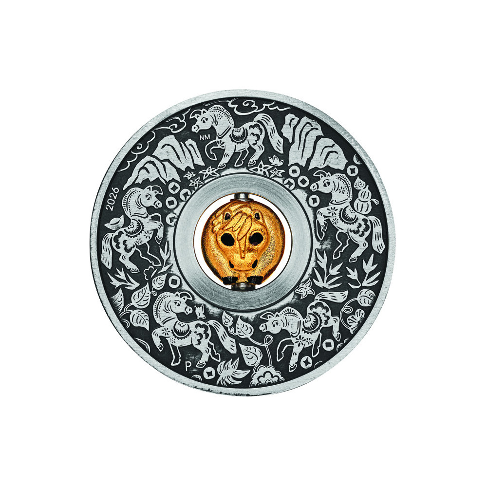 Az érme hátlapján egy ló alakú, forgó, aranyozott ezüstgyöngy látható. Ezt öt különböző helyzetben lévő ló veszi körül, amelyeket a kínai papírvágás stílusában, stilizált lombok közé ágyazva ábrázolnak. A verdejegyen szerepel még a Perth Mint "P" verdejel és a 2026-os kibocsátási évszám.