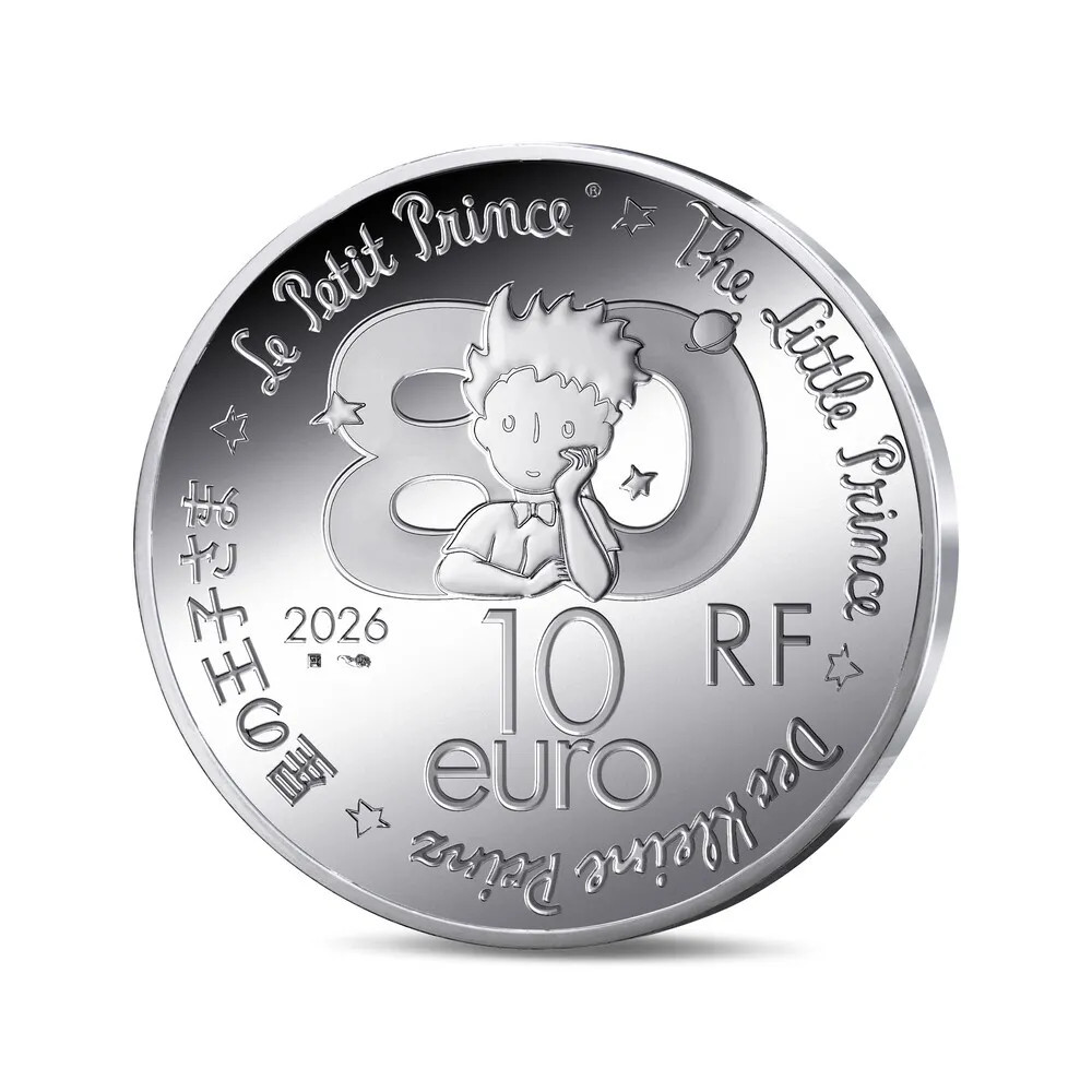 Az érme hátoldalán, a névérték felett a Kis Herceg 80. évfordulójára készült logót a 80-as szám előtt karjára támaszkodó figura mellszobra alkotja. A perem mentén a "Le Petit Prince" felirat francia, angol, német és japán nyelven emlékeztet e figura egyetemes dimenziójára. Szintén szerepelnek rajta az RF betűk, a metszőműhely és a metszőmester jelzései, valamint a 2026-os évszám.