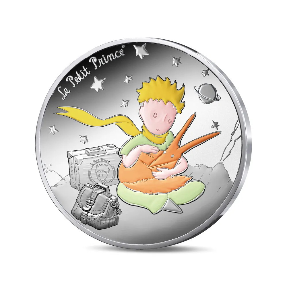 Az érme előlapján a Kis Herceg keresztbe tett lábbal ül középen a bolygója felszínén. Szeretettel néz a rókára, amelyet a karjában tart. A figurától balra két bőrönd áll, készen arra, hogy gazdájuk útnak induljon. A Kis Herceg mögött az égbolton ragyognak a csillagok, amelyek között a Szaturnusz is látható. Az érme szélén a Kis Herceg logója van az égboltba vésve.